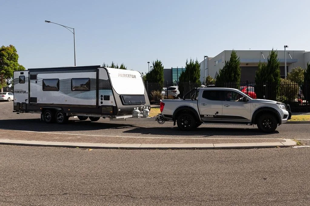 Representative assessment of a modified dual cab vehicle towing a tandem axle caravan.